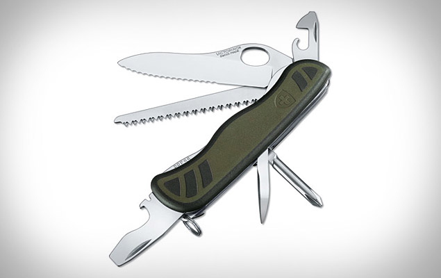 Only the fourth model in the blade's 120-year history, the new Victorinox Swiss Army Soldier Knife ($45) is the best soldier-issue yet. The stylish olive green and black dual density handle holds a Phillips screwdriver, can opener, small screwdriver, bottle opener with locking screwdriver, wire stripper, reamer, seatbelt cutter, key ring, and wood saw, along with a large lock blade for one-hand opening.
